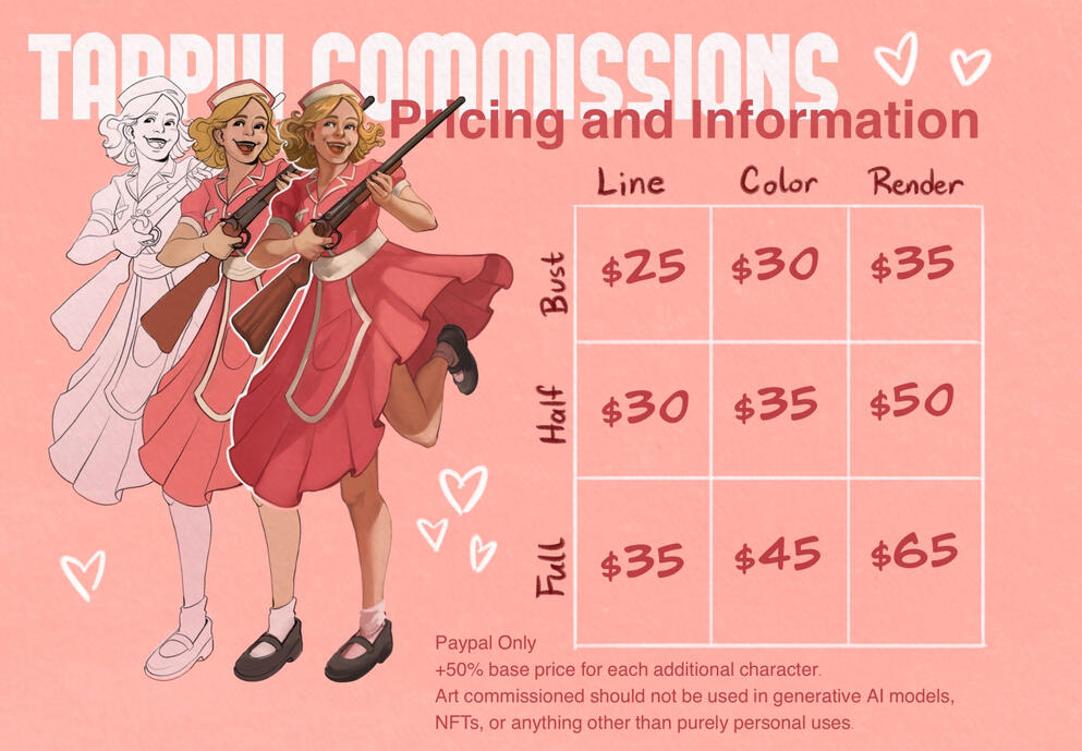 Last Updated: 6/12/2024Subject to Change Without Notice.DISCLAIMER• By purchasing my services (art), you automatically agree to the following conditions.• Please read this entirely and carefully. I will refuse your commission if you do not agree to these terms.• If you are not comfortable with my Terms Of Service and/or are not willing to agree to the conditions, you may not request a commission.• I do not allow my art to be used for AI purposes and alike. Please do not upload it to any AI sites as this could compromise my artwork.• NFT usage is strictly forbidden.• If you have any questions, please contact meUSER AGREEMENTBy commissioning me, you agree that you have read and accepted all the terms described herein.You will agree here to the policy of using the art for personal, non-profit purposes unless otherwise stated, and provide all image credits to me.Violators will be added to my blacklist indefinitely and without warning.GENERALCLIENT• You, the Client, will be expected to first read my TOS and understand my general Commission Prices.• You, the Client, may display my work on external sites as long as it is visibly credited and linked back to me.• You may not upload or host my work in any gallery that is intended to display your own work only.• You may not claim my work as your own.• You may use the Artwork for personal use including but not limited to: avatars, phone or computer wallpapers, and personal website/profile displays.• You reserve the right to print or create an otherwise physical reproduction of the Artwork as long as it is for your PERSONAL use only (ie. NOT for sale).• You may not use the Artwork for redistribution or external projects, commercial or non-commercial (i.e. t-shirts, mugs, public flyers, etc.) unless otherwise discussed.• In the case of an adoptable, you retain the rights to the character design.• You are NOT authorized to change, modify, edit or use my works without my permission. Please ask if you have any questions about this!• You are NOT authorized to trace over my Artwork in any way, including the use of the artwork as a “base.”• Any harassment in an attempt to bargain for a commission (a ‘slot’) is not tolerated. This includes inappropriately worded comments on my profile, as well as private messages. I reserve the right to place anyone on the blacklist over harassment.• Clients who have commissioned and/or received work before this TOS has gone into effect are still bound to its contents.• These clients are permitted to include signatures indicating the Artwork is my intellectual property. Credit in some form is required. I will provide a non watermarked version for your uses, but it will still include my signature• By placing an order, you agree to these terms and conditions. Please read these terms carefully.ARTIST• By commissioning me, you are purchasing my service as an artist only.• I reserve the right to post your finished artwork in my gallery for any reason.• I reserve the right to decline any project or client for any reason.• I reserve the right to refund you the full amount paid if I no longer wish to work on your project for any reason.◆ I do not do the following:• Extreme bara, fetish art, political/controversial topics or anything else that makes me uncomfortable.COPYRIGHT• I reserve the right to sign and/or watermark my own work. I will send you a full-resolution image by email.• You are responsible for protecting your ownership over rights to a character design made by me by creating a copy image with your name added as well (ie. through a watermark) when uploading on external sites.• I retain all copyright over my work, which includes the right to redistribute, reproduce, or use the image as a sample for sales or self-promotion unless otherwise agreed upon. In the case of a Public Commission, I may do whatever I wish with the art (eg. post it to other sites such as Instagram) but will give proper credit to you for ownership of the character’s design.• In the case of a commission, I will not claim the rights to a character design unless it was one of my own designs. Therefore I will not reuse/resell the Artwork for personal or commercial projects unless agreed upon.• In the case of an adoptable design, I will not reuse/resell the rights to the design once ownership is transferred to you, the Client._NDA - PRIVACY REQUEST• If you wish for your request to be private, it must be stated during the ordering process.• I reserve the right to charge a fee if I deem fit.• The privacy request entails that I am not allowed to share any WIPs on social media, nor am I allowed to stream the process of the commission anywhere.• However, this also means that you must refrain from sharing any such spoilers yourself.• The NDA fee usually starts at +5% of the total quote, but it might differ. The bigger the project the bigger the fee.COMMISSIONSORDERING• You are expected to know what you'll be ordering before you contact me! You should have a firm idea of exactly what kind of art you want to commision.• You will then get a reply from me discussing the details (if needed) as well as me confirming your slot.• I reserve the right to make changes to your request as I see fit unless otherwise discussed. To guarantee the total accuracy of your commission request, please make note of the required details and elements in the form.• If your character is extremely detailed, I have the right to charge a fee to include these details. This fee will be stated before the transaction, and you hold the right to make changes to your commission request (eg. change the character, agree to simplified design changes) before the transaction is complete.• Please make your request concisely worded with minimal abbreviations, so as to make the note clear to read.• Before taking part in any transaction, you are required to wait for a reply so that we can discuss the details.PAYMENT